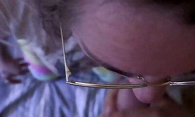 Innocent nerd with glasses guzzles rod tirelessly to get some jizz on her face